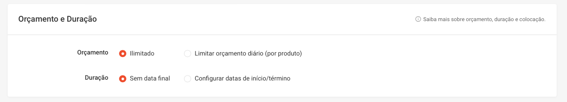 Insira seu orçamento diário. Certifique-se de que ele seja suficiente para a exploração de tráfego e para garantir que seus novos produtos conquistem pedidos iniciais mais rapidamente.