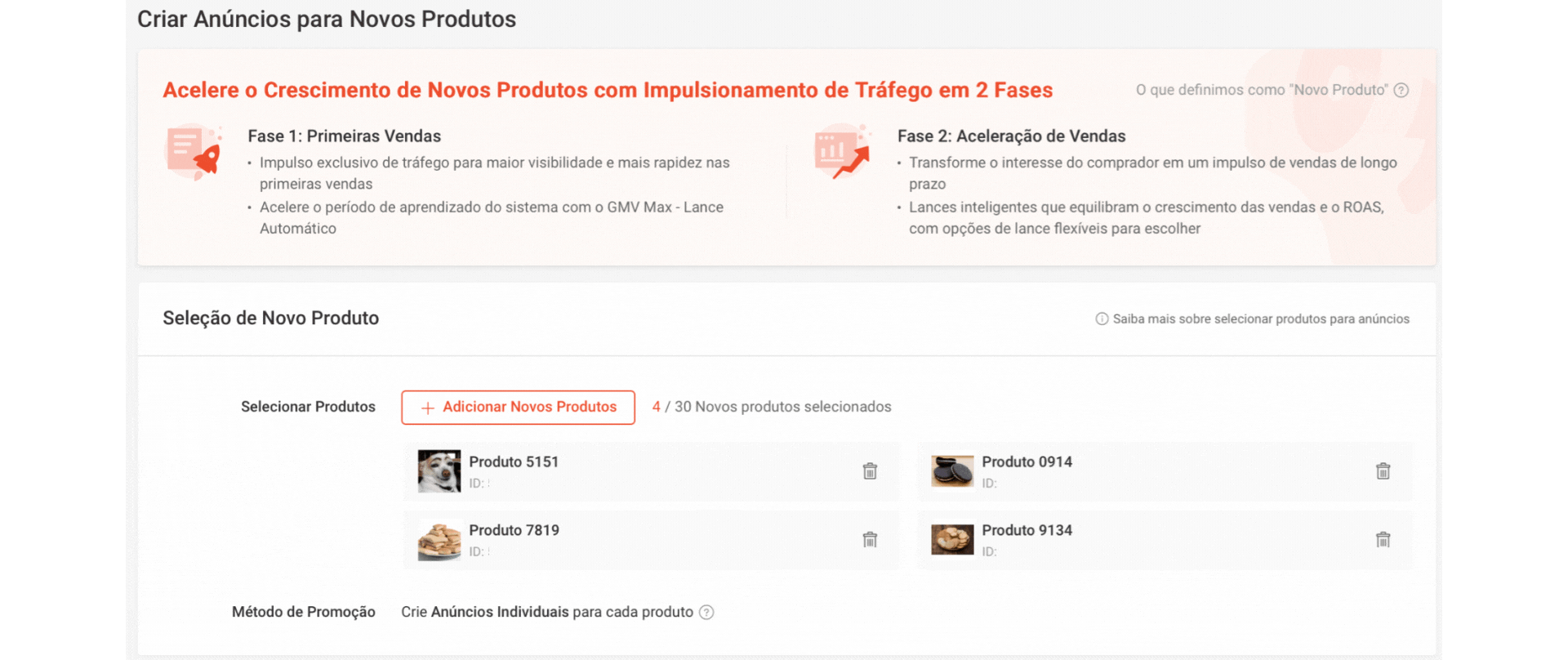 Conseguir os primeiros pedidos rapidamente é essencial para impulsionar o crescimento de um novo produto. Por isso, apresentamos o “Promover Meus Novos Produtos” - uma versão aprimorada e mais inteligente do NPB 2.0 - desenvolvida para ajudar novos cadastros a ganharem tráfego, conquistarem as primeiras vendas e acelerarem o crescimento em duas etapas simples.