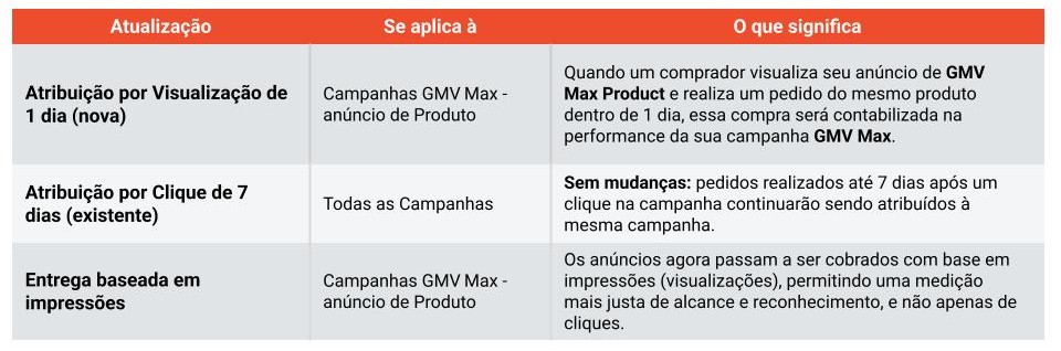 2. Será introduzida uma nova atribuição por visualização de 1 dia (para campanhas GMV Max Produto);